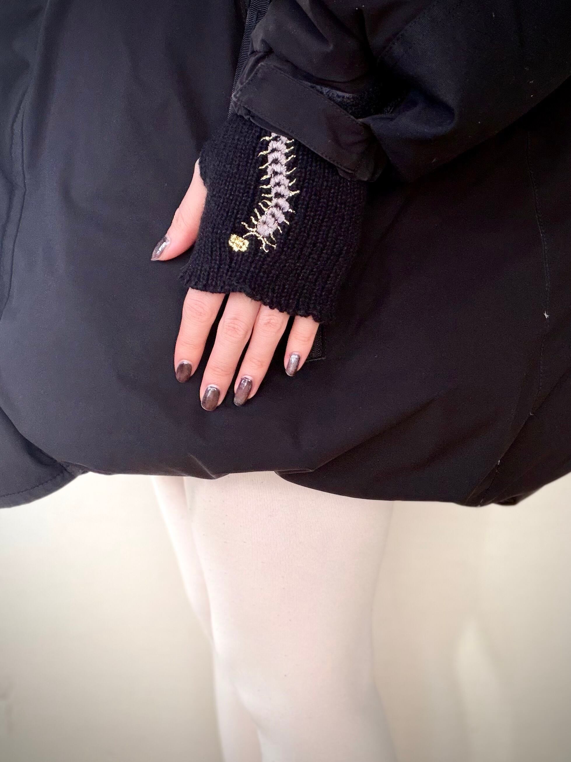 むかでが刺繍が施されたニットアームカバー